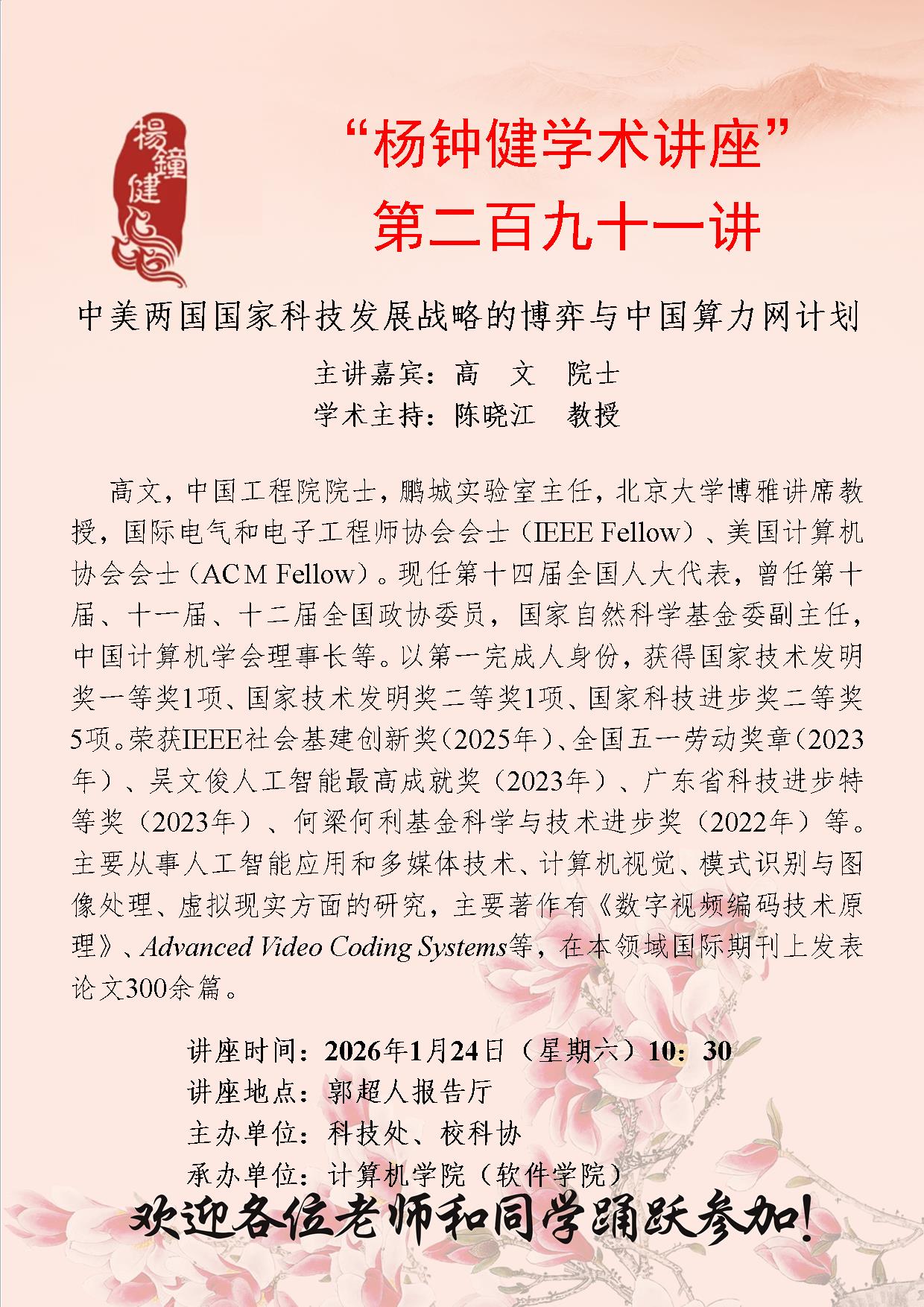 高文 院士 “杨钟健学术讲座”第二百九十一讲:中美两国国家科技发展战略的博弈与中国算力网计划 讲座时间 2026年1月24日(星期六)10:30 讲座地点 郭超人报告厅 讲座人介绍 高文 院士 讲座内容