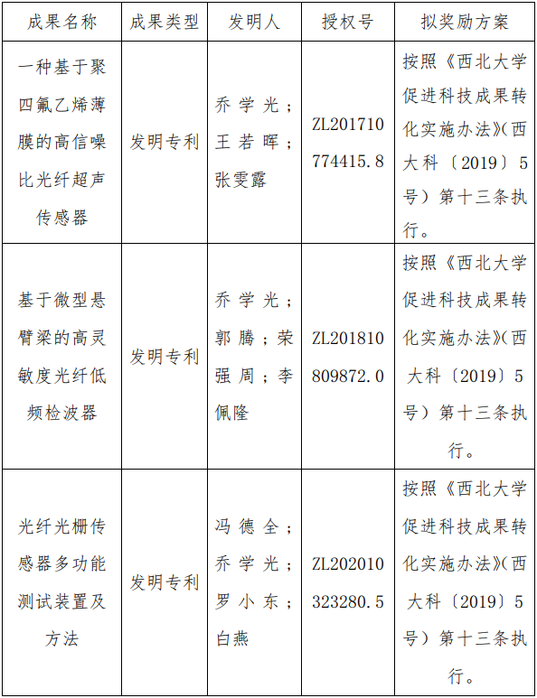 按照《云博app官方在线入口促进科技成果转化实施办法》(西大科〔2019〕5号)相关规定,拟对云博app官方在线入口物理学院乔学光教授作为成果负责人的3项发明专利权实施普通许可,现将相关信息公示如下: