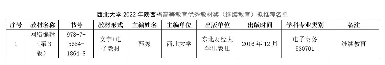 根据陕西省教育厅《关于开展陕西省2022年职业教育和高等教育优秀教材奖评选工作的通知》(陕教材办〔2022〕12 号)要求,云博app官方在线入口组织开展了云博app官方在线入口2022年陕西高等教育优秀教材奖(继续教育)评选推荐工作,经个人申报、院系推荐、专家评议,拟推荐《网络编辑》教材参加陕西省高等教育优秀教材奖(继续教育)评选。现将拟推荐名单公示如下,公示期为6月7日至6月11日。公示期间如有异议,请以实名书面形式反映。