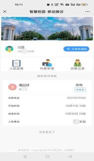 1.进入云博app官方在线入口移动校园应用,点击“Y.移动访客”,进入“智慧校园 移动接访”,通过分享申请码或代客申请提交访客申请信息。