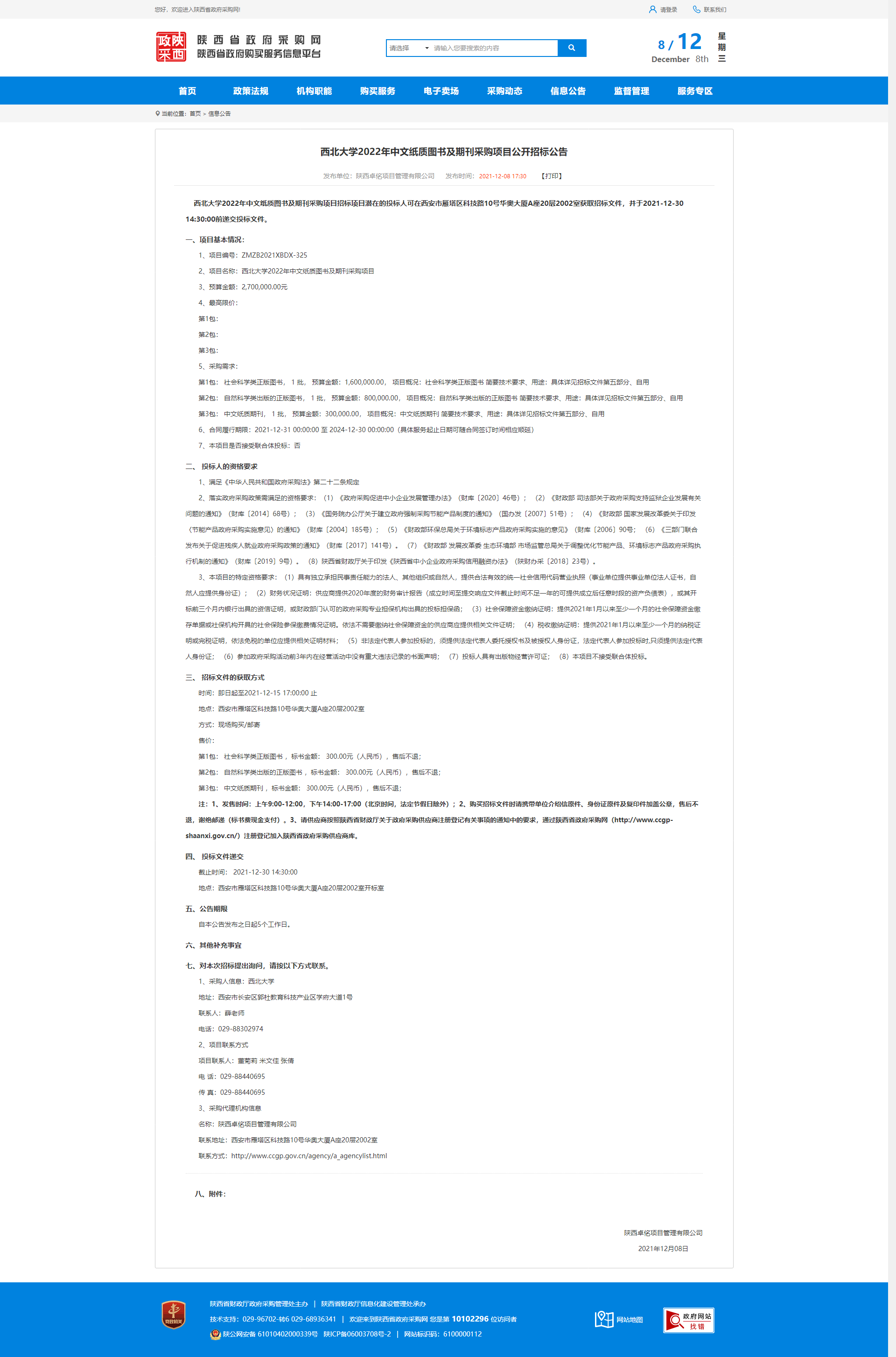 云博app官方在线入口2022年中文纸质图书及期刊采购项目公开招标公告 作者: 编辑:薛利娟 时间:2021-12-08 原公告链接:http://www.ccgp-shaanxi.gov.cn/notice/noticeDetail.do?noticeguid=8a85be317d6a7607017d991af3612a99