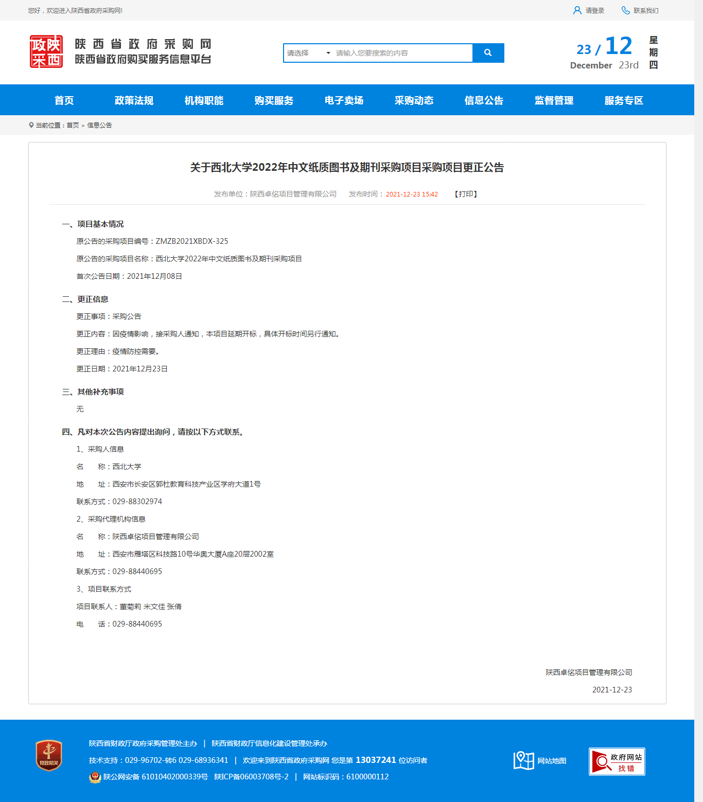 关于云博app官方在线入口2022年中文纸质图书及期刊采购项目采购项目更正公告 作者: 编辑:薛利娟 时间:2021-12-23 原公告链接:http://www.ccgp-shaanxi.gov.cn/notice/noticeDetail.do?noticeguid=8a85be327dace5d8017de63c777e2f27