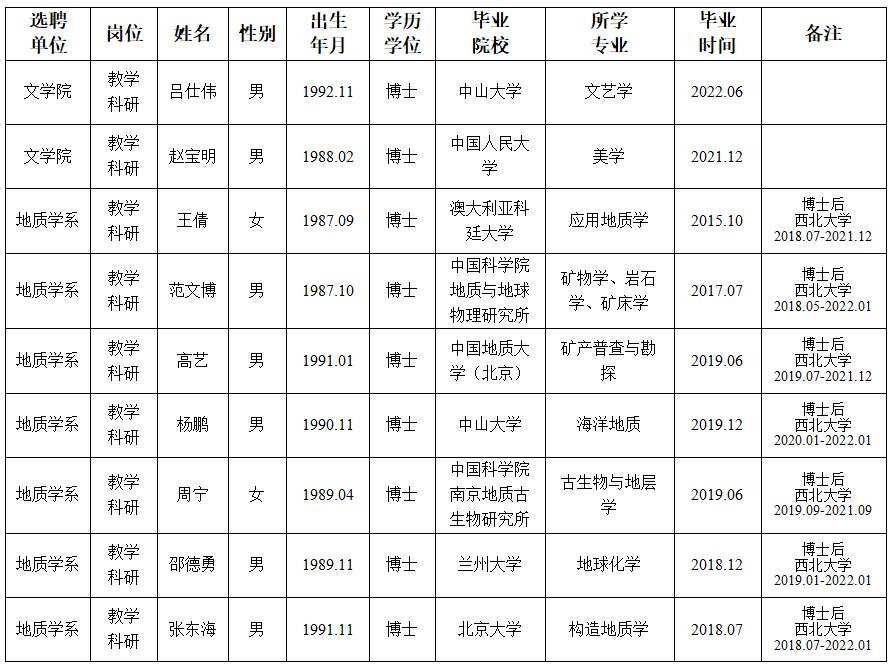 经用人单位及教学督导考核、学校研究,拟同意选聘下列人员来校工作,其聘任关系为A类人事代理。本着公平、公正、公开的原则,现将拟选聘人员基本情况公示如下: