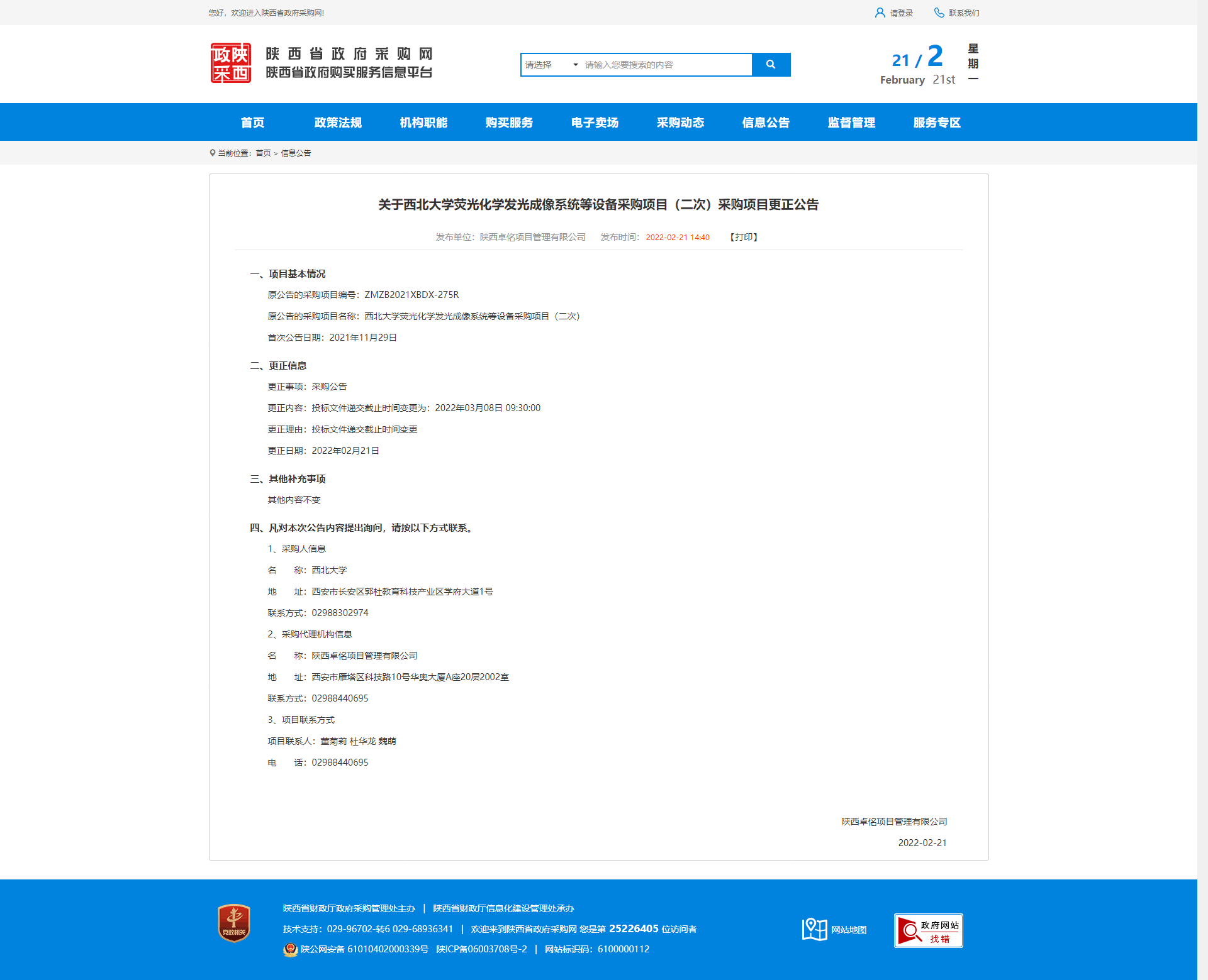 关于云博app官方在线入口荧光化学发光成像系统等设备采购项目(二次)采购项目更正公告 作者: 编辑:薛利娟 时间:2022-02-21 原公告链接:http://www.ccgp-shaanxi.gov.cn/notice/noticeDetail.do?noticeguid=8a85be317ee7907d017f1aa113f346e8