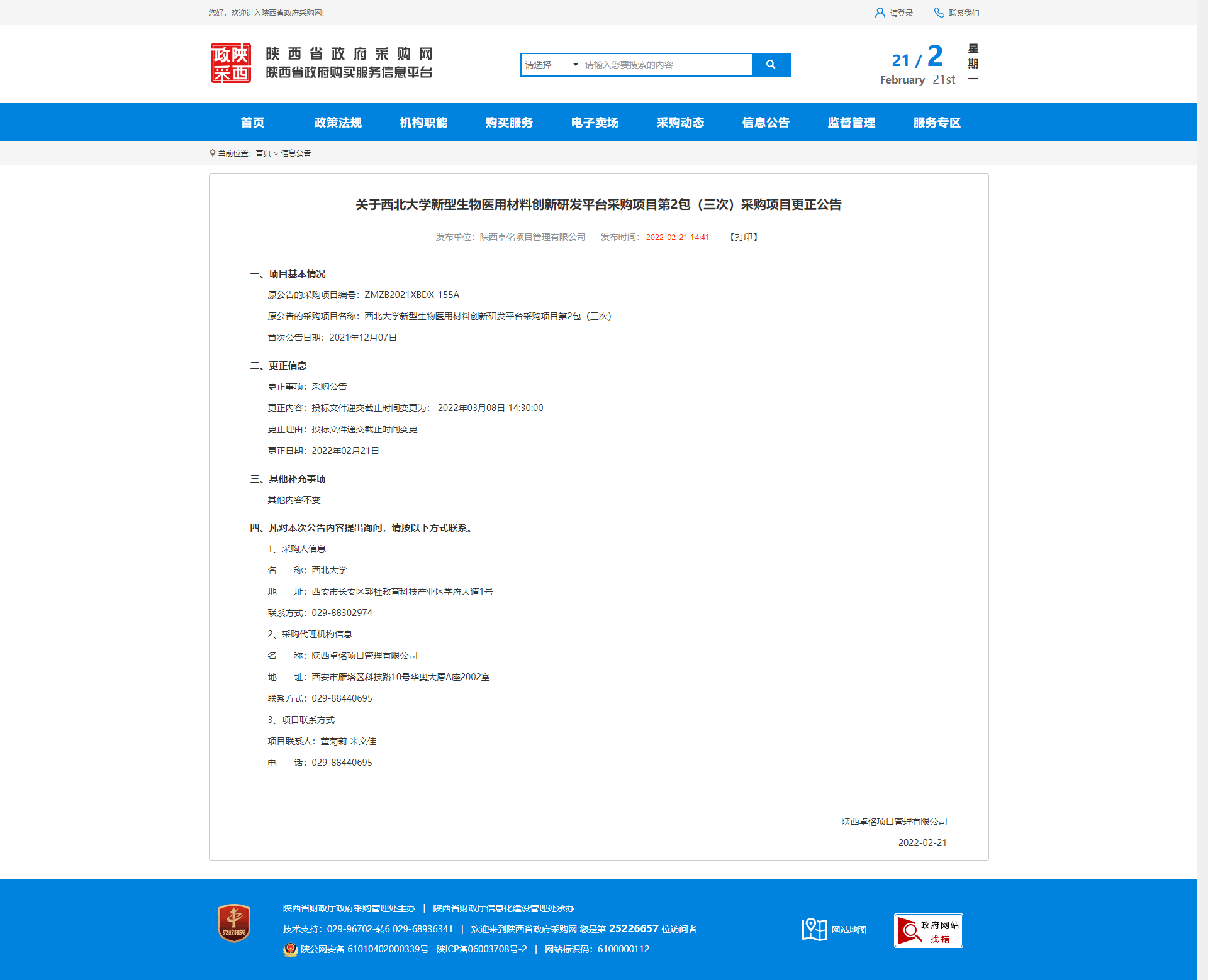 关于云博app官方在线入口新型生物医用材料创新研发平台采购项目第2包(三次)采购项目更正公告 作者: 编辑:薛利娟 时间:2022-02-21 原公告链接:http://www.ccgp-shaanxi.gov.cn/notice/noticeDetail.do?noticeguid=8a85be317ee7907d017f1a9fc1d146e6