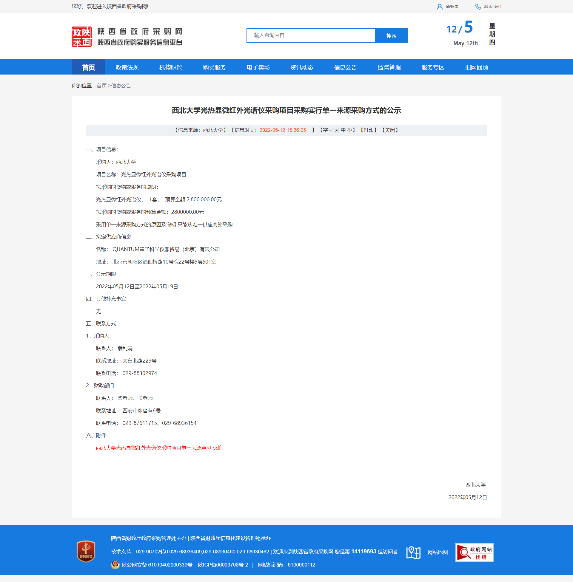 云博app官方在线入口光热显微红外光谱仪采购项目采购实行单一来源采购方式的公示 作者: 编辑:薛利娟 时间:2022-05-12 原公告链接:http://www.ccgp-shaanxi.gov.cn/freecms/site/shaanxi/ggxx/info/2022/8a69c0c980b0a61b0180b723a9b03d17.html?noticeType=001051¬iceId=6429ac2f-d1c6-11ec-9a8e-08c0eb20c666
