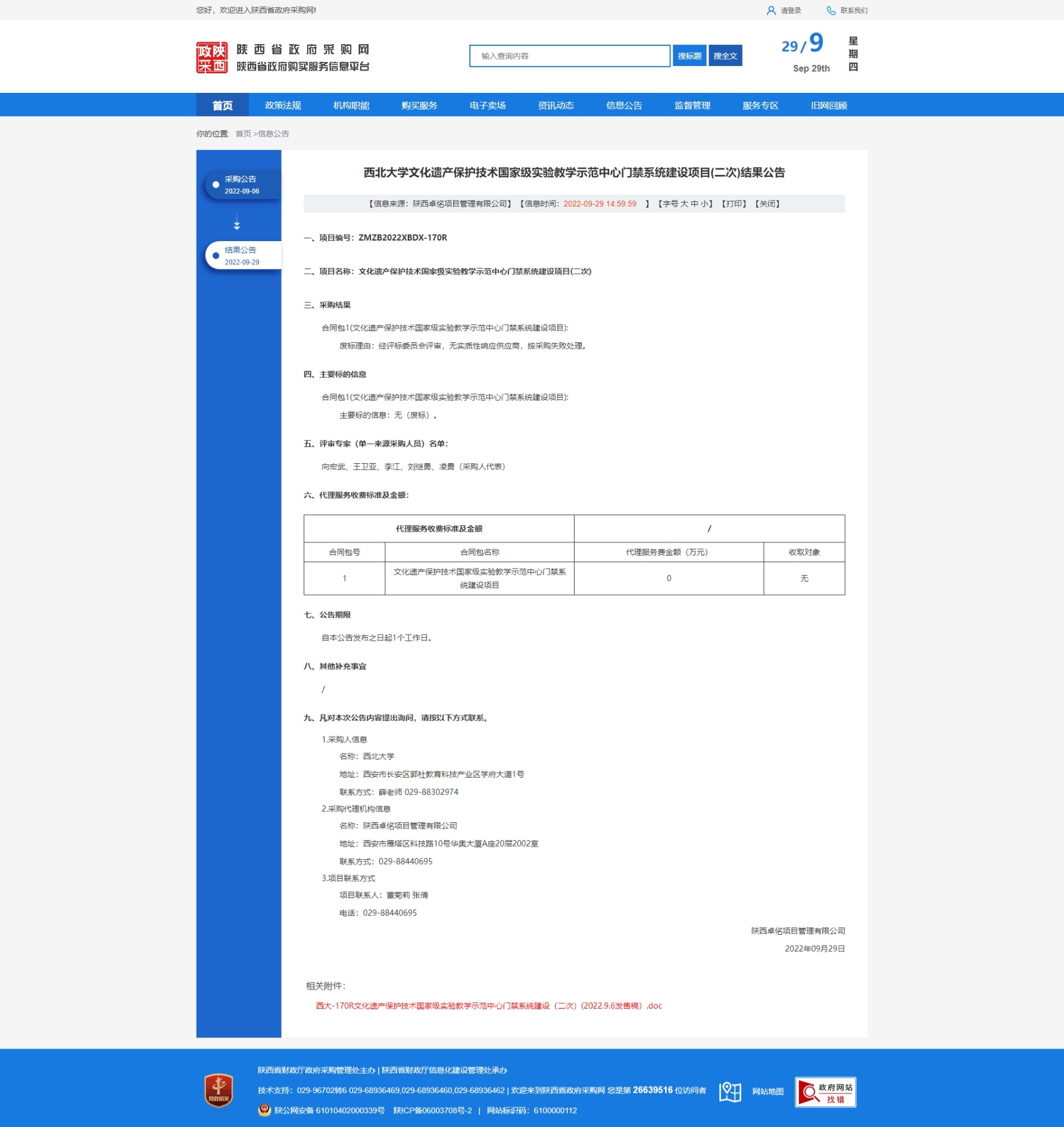 云博app官方在线入口文化遗产保护技术国家级实验教学示范中心门禁系统建设项目(二次)结果公告 作者: 编辑:采购与招标办公室 时间:2022-09-29 原公告链接:http://www.ccgp-shaanxi.gov.cn/freecms/site/shaanxi/ggxx/info/2022/8a69c63182a3253801838804b178380f.html?noticeType=001006¬iceId=dee0a350-3fc4-11ed-9a8e-08c0eb20c666