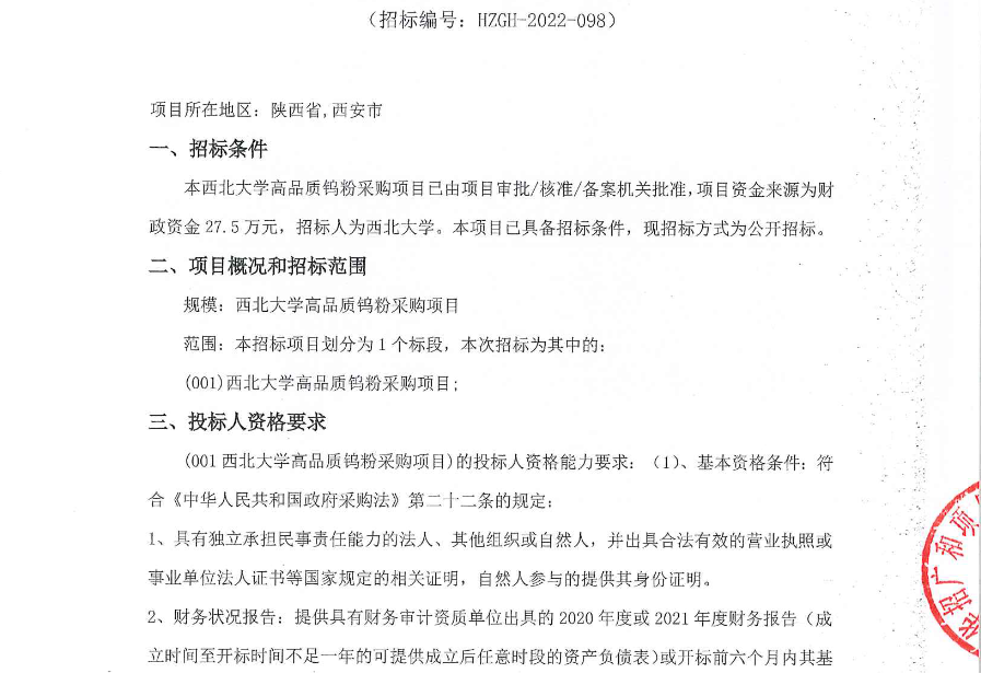 云博app官方在线入口高品质钨粉采购项目公开招标公告 作者: 编辑:采购与招标办公室 时间:2022-11-23 原公告链接:http://bulletin.sntba.com/biddingBulletin/2022-11-23/502149.html