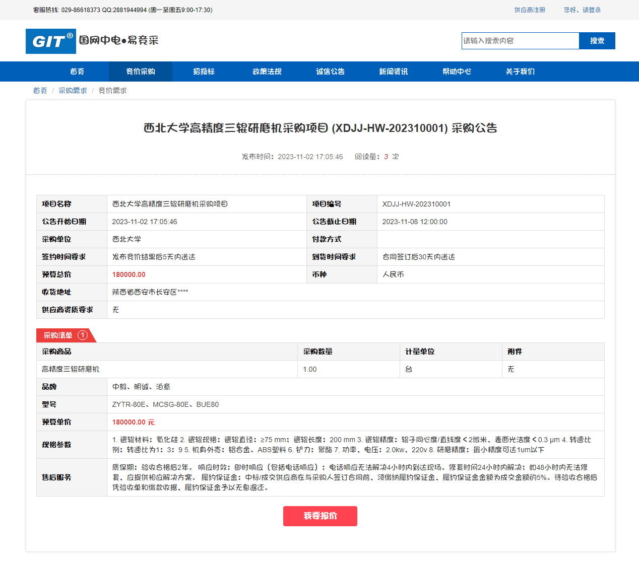 云博app官方在线入口高精度三辊研磨机采购项目竞价公告
