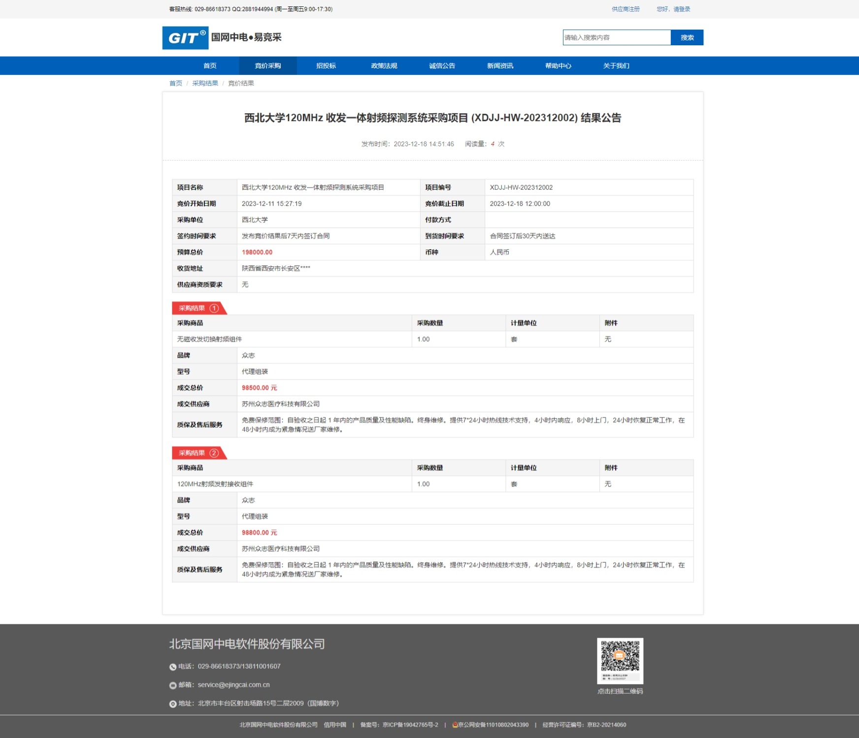 云博app官方在线入口120MHz 收发一体射频探测系统采购项目 (XDJJ-HW-202312002) 结果公告 作者: 编辑:采购与招标办公室 时间:2023-12-18 原公告链接:https://www.ejingcai.com.cn/site/bidding/detail/7902