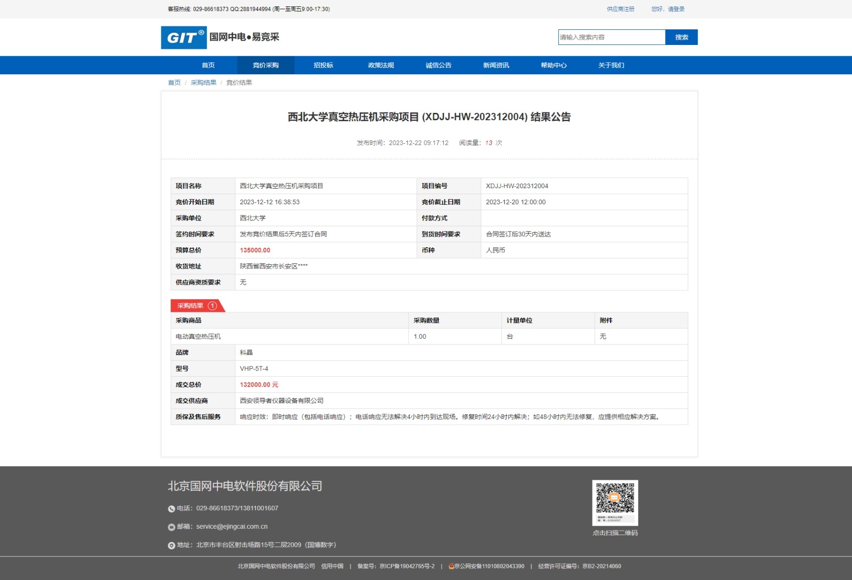云博app官方在线入口真空热压机采购项目 (XDJJ-HW-202312004) 竞价结果公告 作者: 编辑:采购与招标办公室 时间:2023-12-22 原公告链接:https://www.ejingcai.com.cn/site/bidding/detail/7982