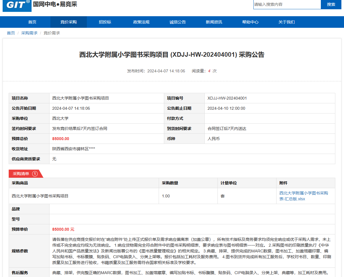 云博app官方在线入口附属小学图书采购项目 (XDJJ-HW-202404001) 竞价公告 作者: 编辑: 时间:2024-04-07 原公告链接:https://www.ejingcai.com.cn/site/bidding/detail/9303