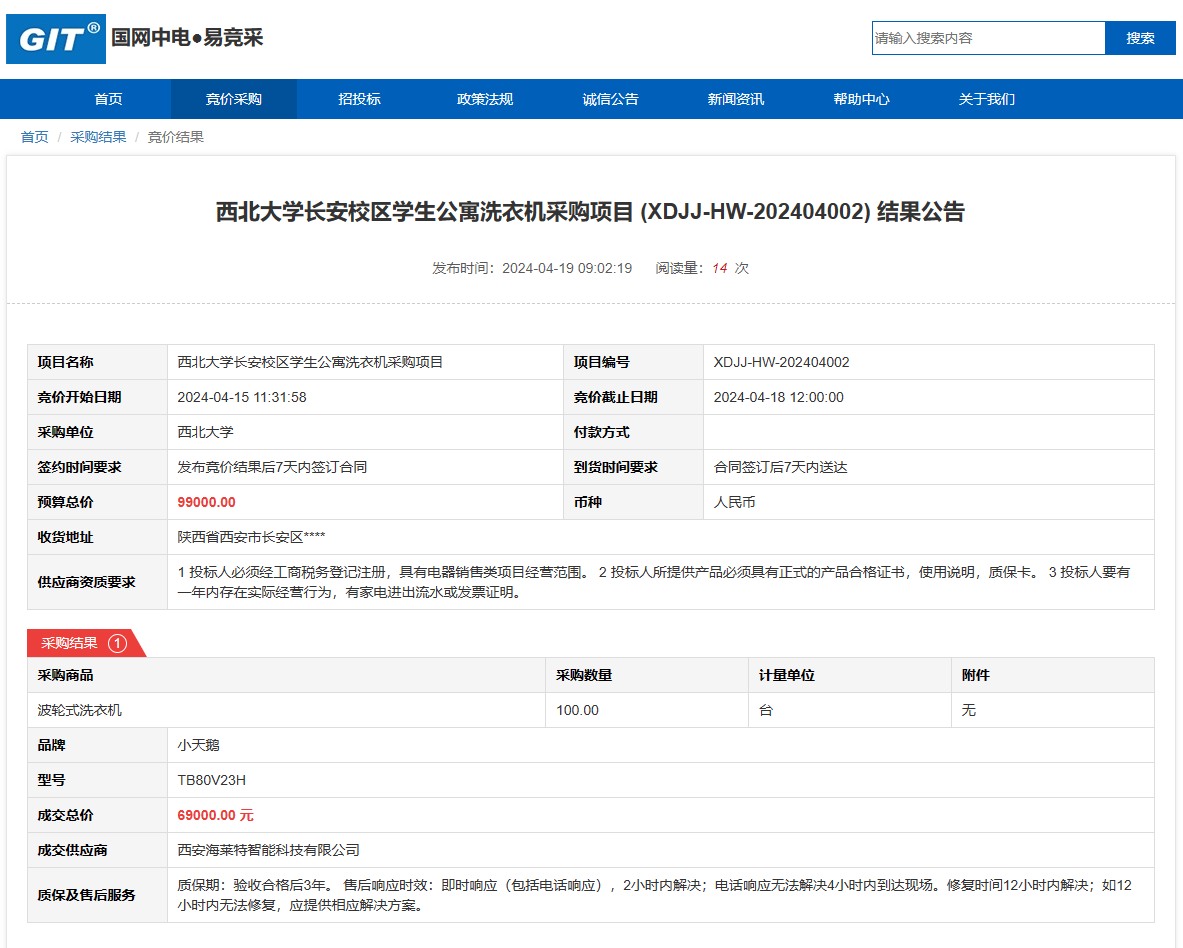 云博app官方在线入口长安校区学生公寓洗衣机采购项目 (XDJJ-HW-202404002) 竞价结果公告 作者: 编辑: 时间:2024-04-19 原公告链接:https://www.ejingcai.com.cn/site/bidding/detail/9576