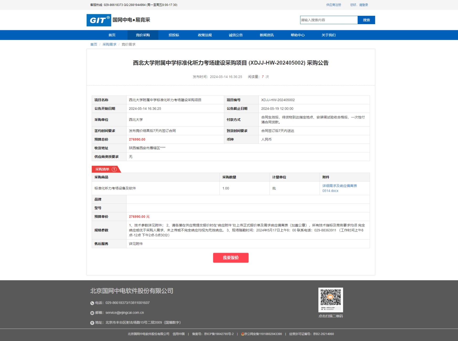 云博app官方在线入口附属中学标准化听力考场建设采购项目 (XDJJ-HW-202405002) 竞价采购公告 作者: 编辑:采购与招标办公室 时间:2024-05-14 原公告链接:https://www.ejingcai.com.cn/site/bidding/detail/10191