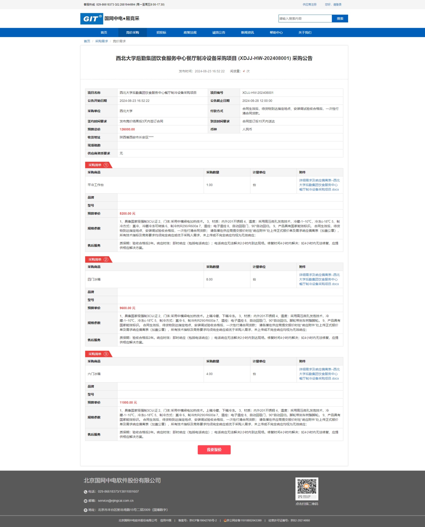 云博app官方在线入口后勤集团饮食服务中心餐厅制冷设备采购项目 (XDJJ-HW-202408001) 竞价公告 作者: 编辑:采购与招标办公室 时间:2024-08-23 原公告链接:https://www.ejingcai.com.cn/site/bidding/detail/12189