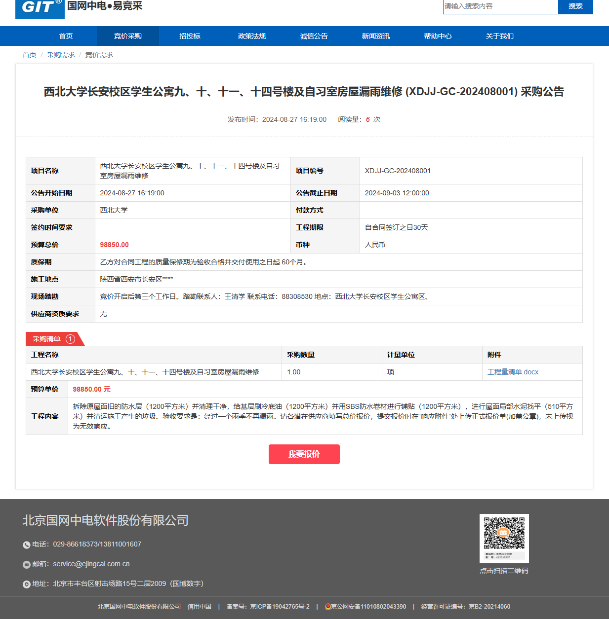 云博app官方在线入口长安校区学生公寓九、十、十一、十四号楼及自习室房屋漏雨维修 (XDJJ-GC-202408001) 竞价采购公告 作者: 编辑: 时间:2024-08-27 原公告链接:https://www.ejingcai.com.cn/site/bidding/detail/12232