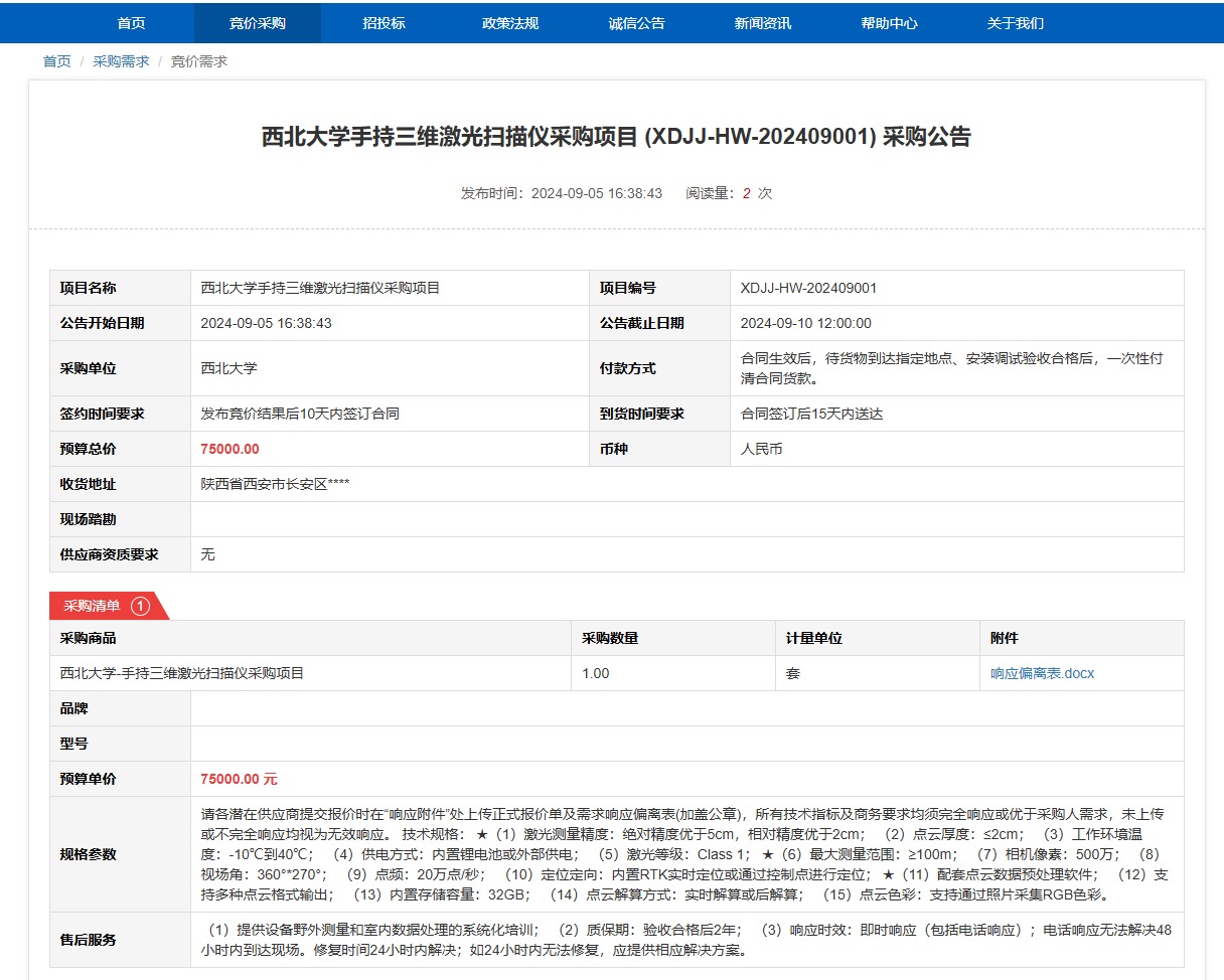 云博app官方在线入口手持三维激光扫描仪采购项目 (XDJJ-HW-202409001) 竞价采购公告 作者: 编辑: 时间:2024-09-05 原公告链接:https://www.ejingcai.com.cn/site/bidding/detail/12357