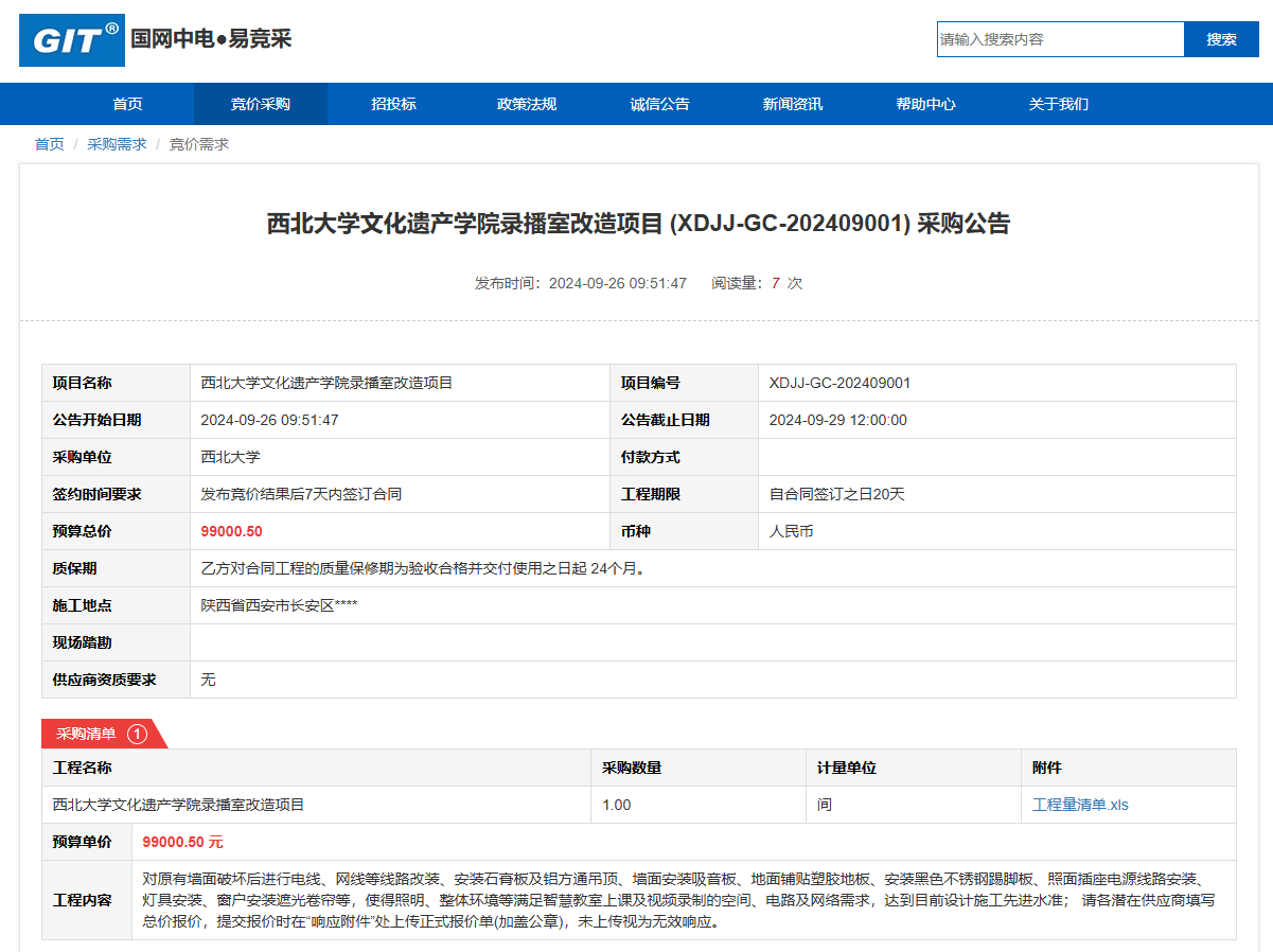云博app官方在线入口文化遗产学院录播室改造项目 (XDJJ-GC-202409001)竞价采购公告 作者: 编辑: 时间:2024-09-26 原公告链接:https://www.ejingcai.com.cn/site/bidding/detail/12907