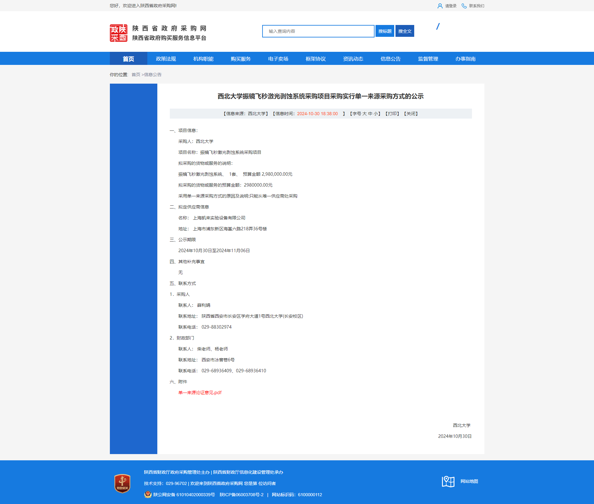 云博app官方在线入口振镜飞秒激光剥蚀系统采购项目采购实行单一来源采购方式的公示