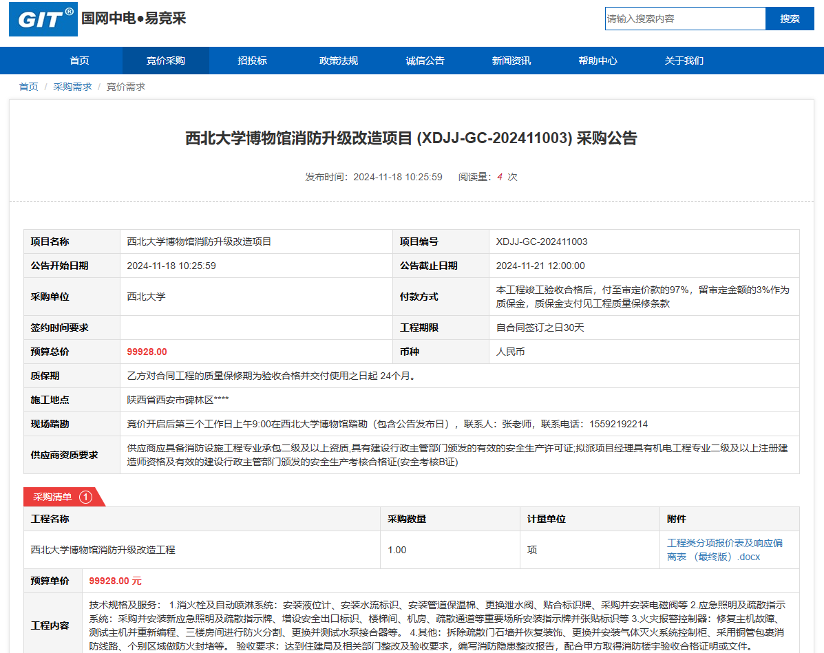 云博app官方在线入口博物馆消防升级改造项目(XDJJ-GC-202411003)竞价采购公告 作者:采购与招标办公室 编辑: 时间:2024-11-18 原公告链接:https://www.ejingcai.com.cn/site/bidding/detail/15007