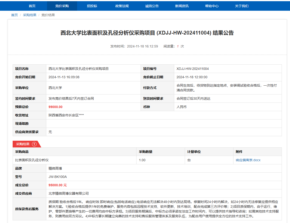 云博app官方在线入口比表面积及孔径分析仪采购项目(XDJJ-HW-202411004)竞价结果公告 作者:采购与招标办公室 编辑: 时间:2024-11-18 原公告链接:https://www.ejingcai.com.cn/site/bidding/detail/15036