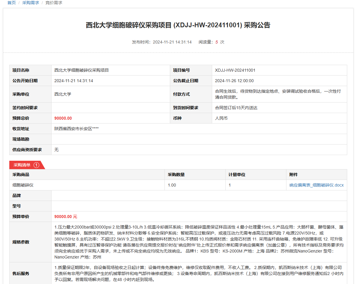 云博app官方在线入口细胞破碎仪采购项目(XDJJ-HW-202411001)竞价采购公告 作者:采购与招标办公室 编辑: 时间:2024-11-21 原公告链接:https://www.ejingcai.com.cn/site/bidding/detail/15200