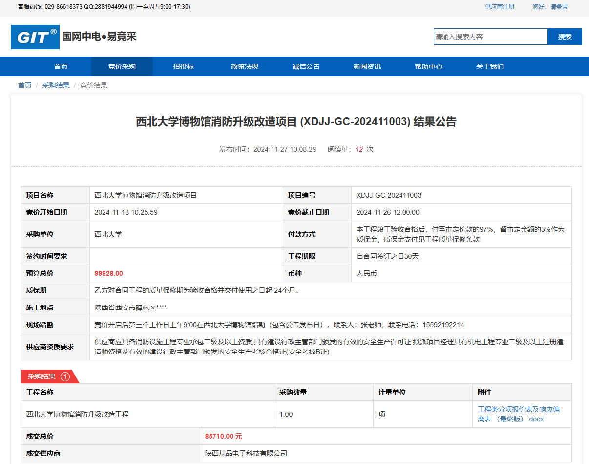 云博app官方在线入口博物馆消防升级改造项目(XDJJ-GC-202411003)竞价结果公告 作者:采购与招标办公室 编辑: 时间:2024-11-27 原公告链接:https://www.ejingcai.com.cn/site/bidding/detail/15427