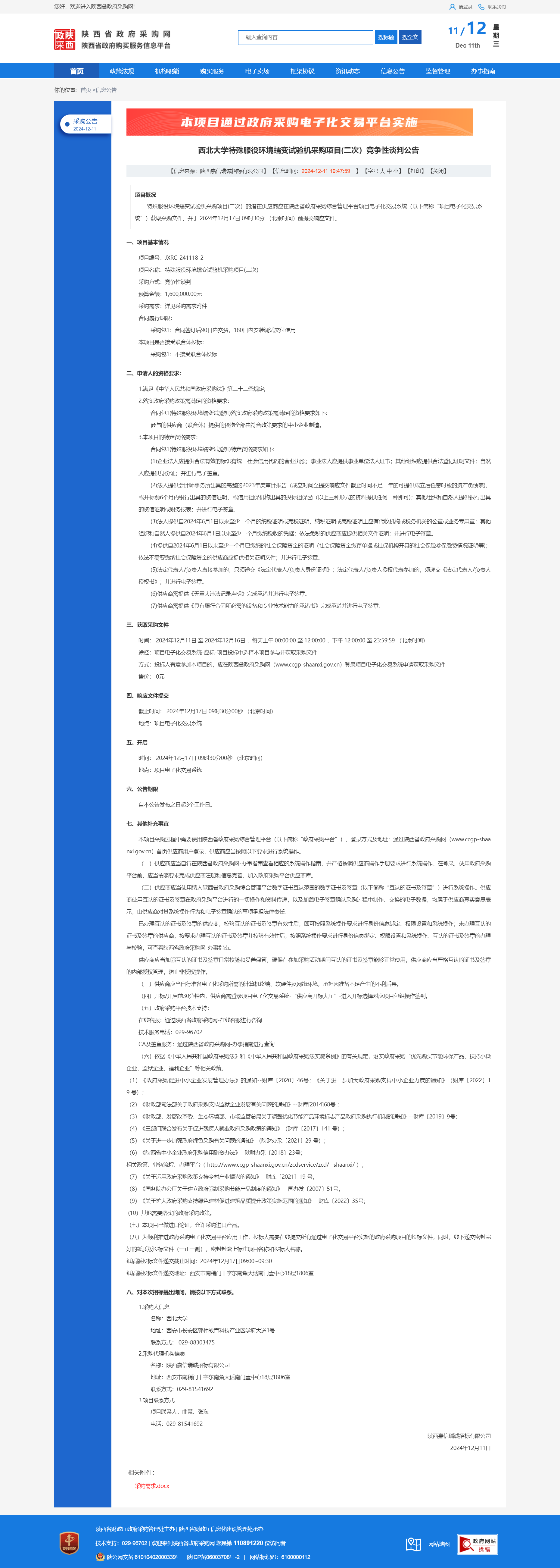 云博app官方在线入口特殊服役环境蠕变试验机采购项目(二次)竞争性谈判公告 作者:采购与招标办公室 编辑: 时间:2024-12-11 原公告链接:https://www.ccgp-shaanxi.gov.cn/freecms/site/shaanxi/ggxx/info/2024/8a69c5a59218576d0193b572f0492761.html?noticeType=001013¬iceId=632dd20f-b7b7-11ef-8063-08c0eb20c666