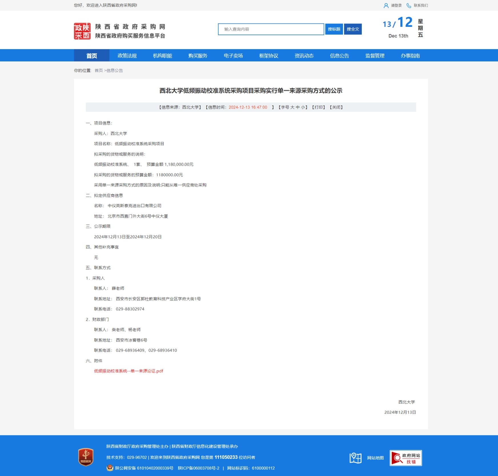 云博app官方在线入口低频振动校准系统采购项目采购实行单一来源采购方式的公示