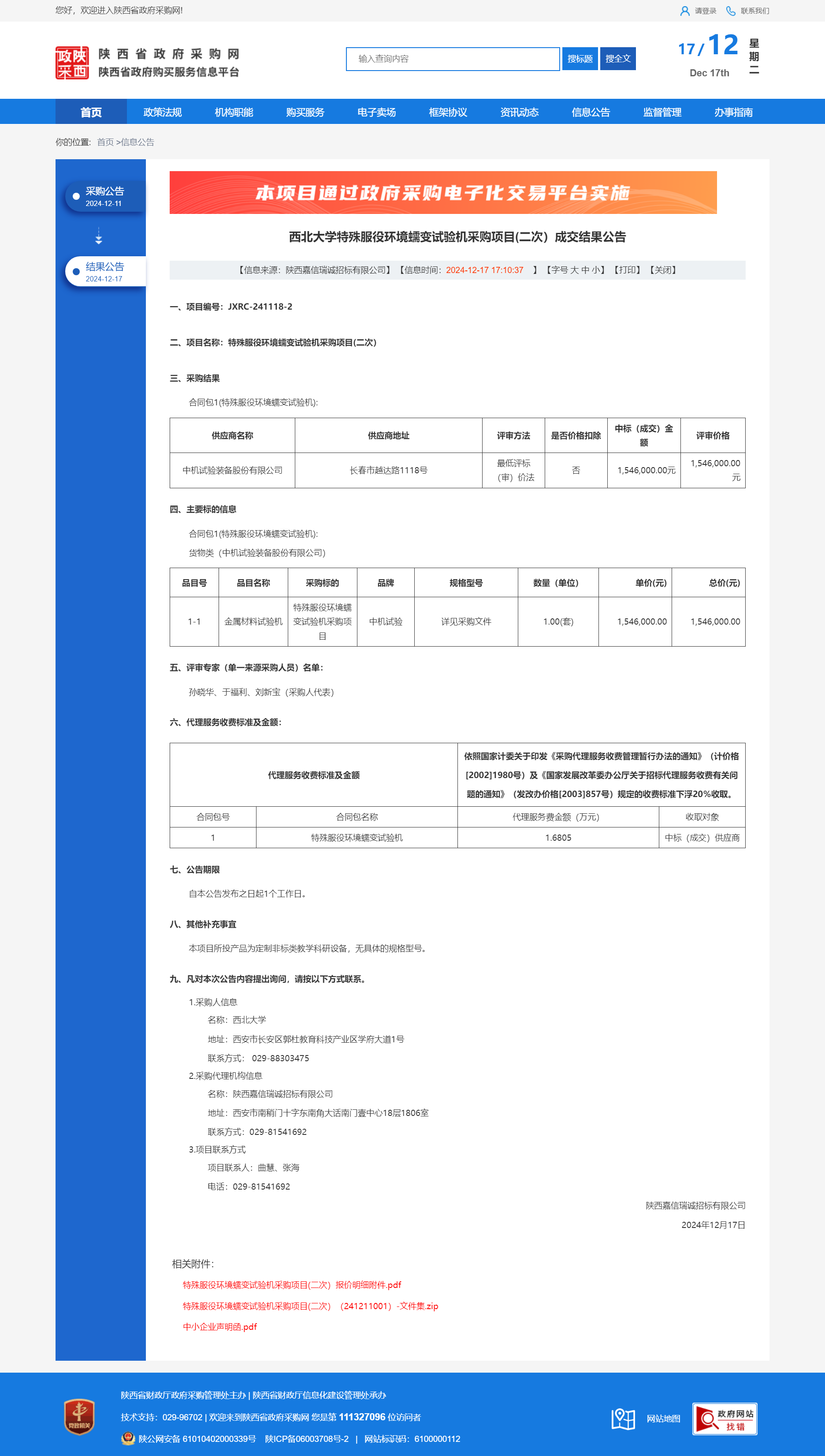 云博app官方在线入口特殊服役环境蠕变试验机采购项目(二次)成交结果公告 作者:采购与招标办公室 编辑: 时间:2024-12-17 原公告链接:https://www.ccgp-shaanxi.gov.cn/freecms/site/shaanxi/ggxx/info/2024/8a69c251921857370193d3cba5716502.html?noticeType=001023¬iceId=69320abb-bc58-11ef-8063-08c0eb20c666