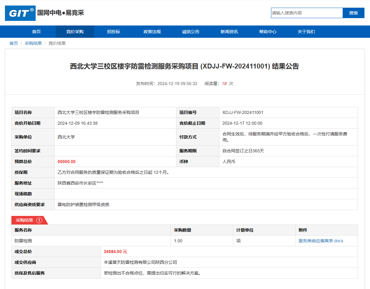 云博app官方在线入口三校区楼宇防雷检测服务采购项目(XDJJ-FW-202411001)竞价结果公告 作者:采购与招标办公室 编辑: 时间:2024-12-19 原公告链接:https://www.ejingcai.com.cn/site/bidding/detail/16077