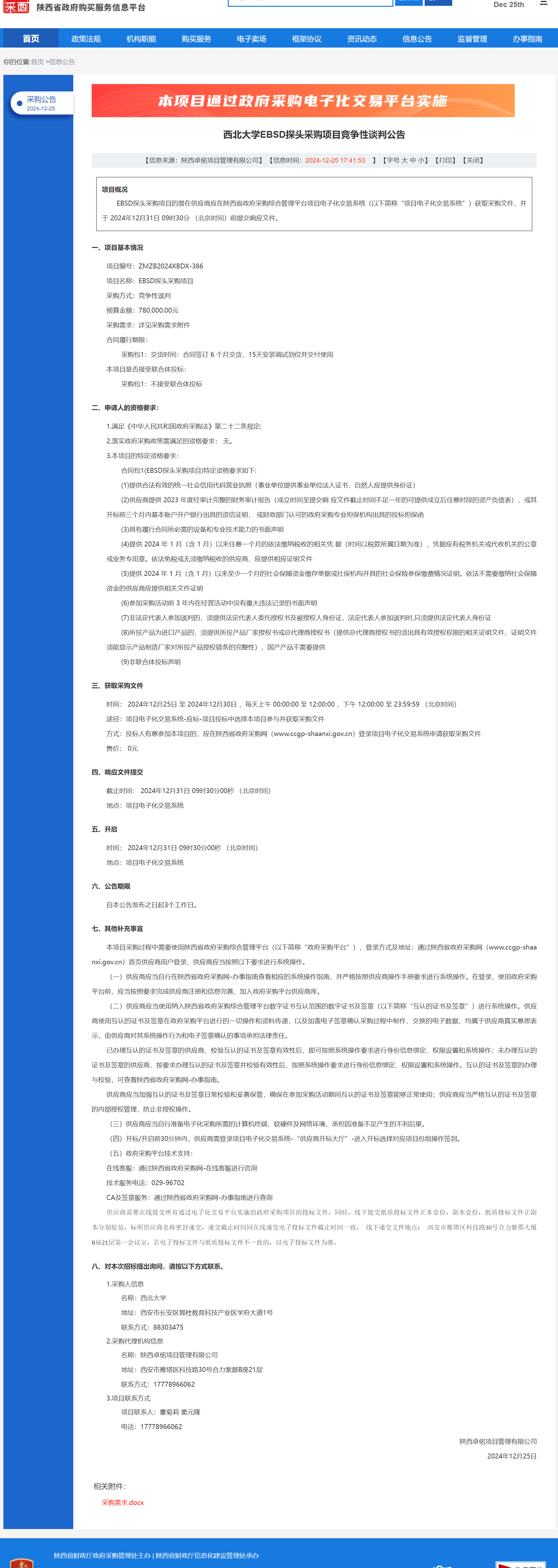 云博app官方在线入口EBSD探头采购项目竞争性谈判公告 作者:采购与招标办公室 编辑: 时间:2024-12-25 原公告链接:https://www.ccgp-shaanxi.gov.cn/freecms/site/shaanxi/ggxx/info/2024/8a69c251921857370193fd2ded71224e.html?noticeType=001013¬iceId=1e749fa7-c2a6-11ef-8063-08c0eb20c666