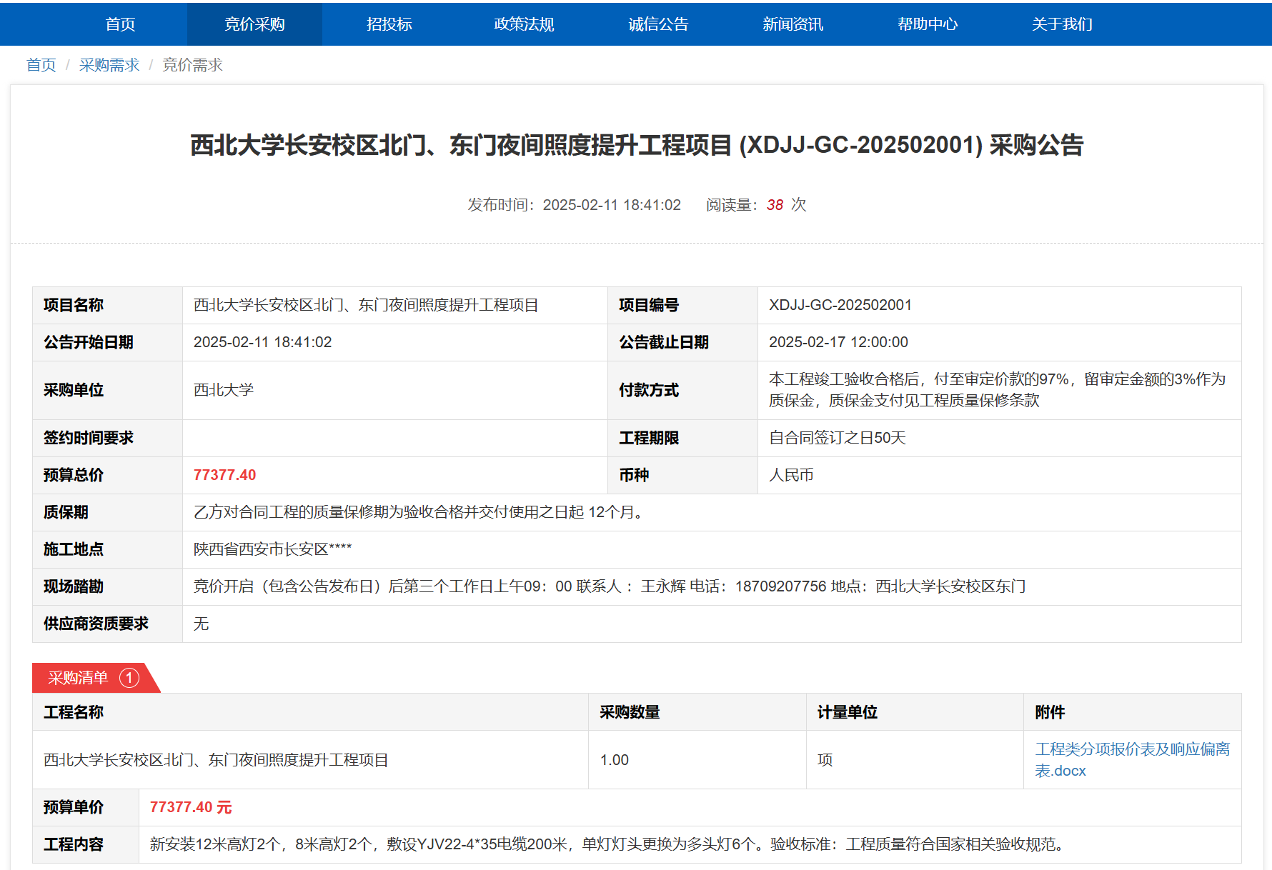 云博app官方在线入口长安校区北门、东门夜间照度提升工程项目(XDJJ-GC-202502001)竞价采购公告 作者:采购与招标办公室 编辑: 时间:2025-02-11 原公告链接:https://www.ejingcai.com.cn/site/bidding/detail/16497