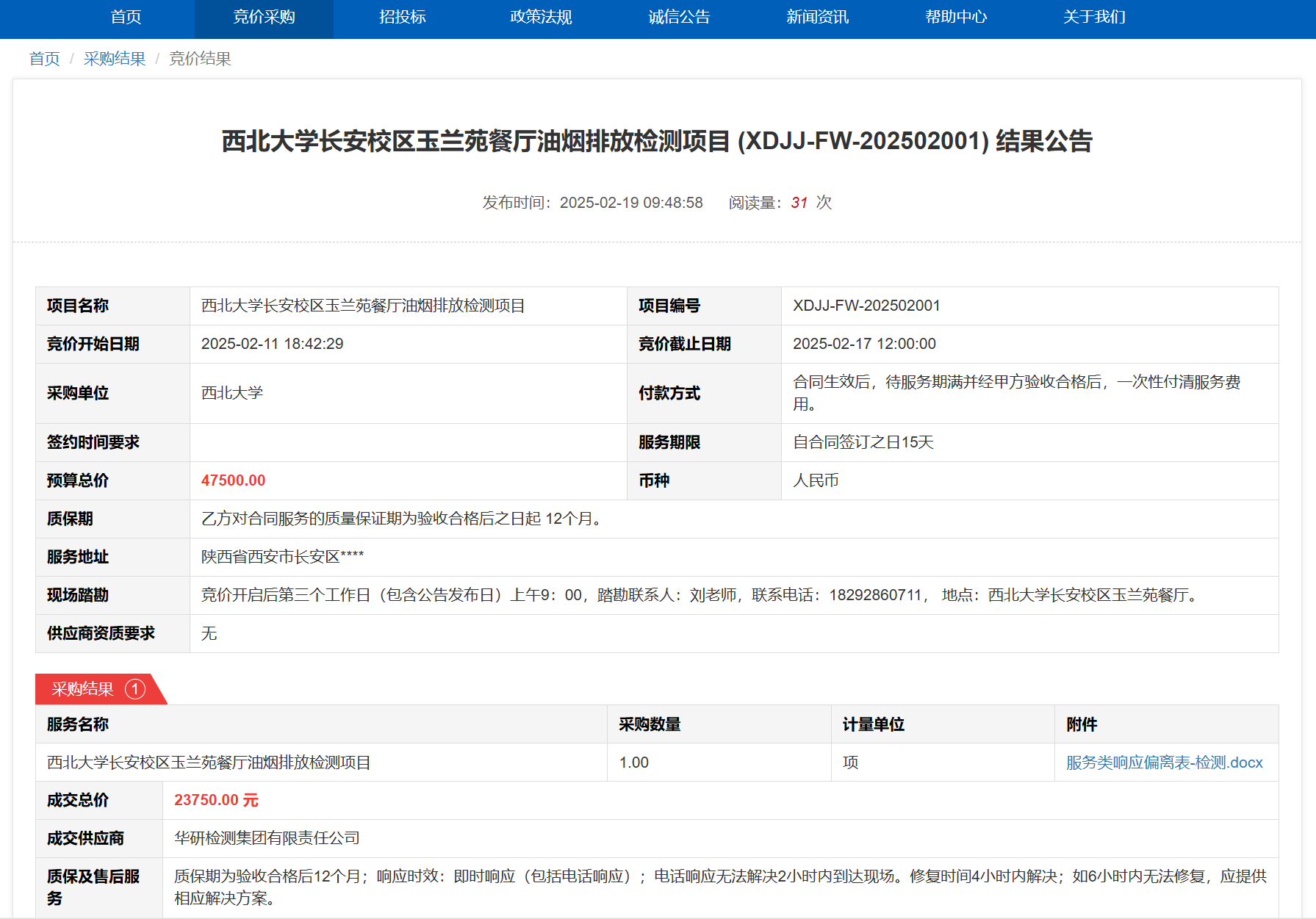 云博app官方在线入口长安校区玉兰苑餐厅油烟排放检测项目(XDJJ-FW-202502001)竞价结果公告 作者:采购与招标办公室 编辑: 时间:2025-02-19 原公告链接:https://www.ejingcai.com.cn/site/bidding/detail/16552