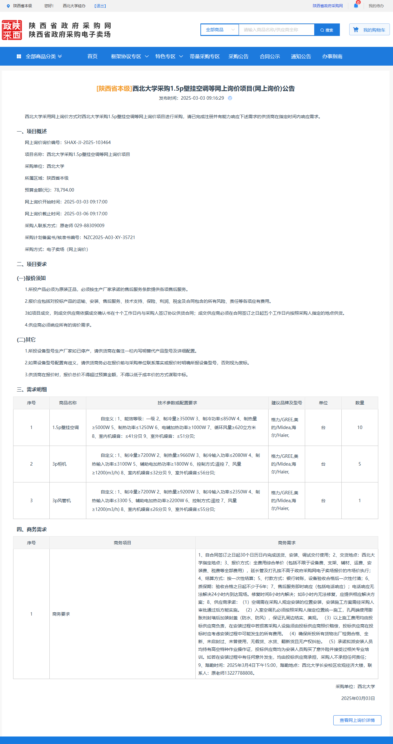 云博app官方在线入口采购1.5p壁挂空调等网上询价项目(网上询价)公告 作者:采购与招标办公室 编辑: 时间:2025-03-03 原公告链接:https://www.ccgp-shaanxi.gov.cn/gpmall-main-web/basic/noticeDetail?noticeGuid=7295516810999431168