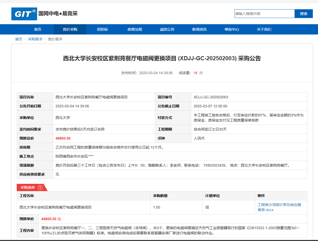 云博app官方在线入口长安校区紫荆苑餐厅电磁阀更换项目(XDJJ-GC-202502003)竞价采购公告 作者:采购与招标办公室 编辑: 时间:2025-03-04 原公告链接:https://www.ejingcai.com.cn/site/bidding/detail/16712