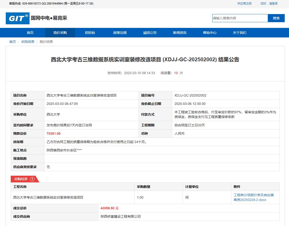 云博app官方在线入口考古三维数据系统实训室装修改造项目(XDJJ-GC-202502002)竞价结果公告 作者:采购与招标办公室 编辑: 时间:2025-03-10 原公告链接:https://www.ejingcai.com.cn/site/bidding/detail/16795