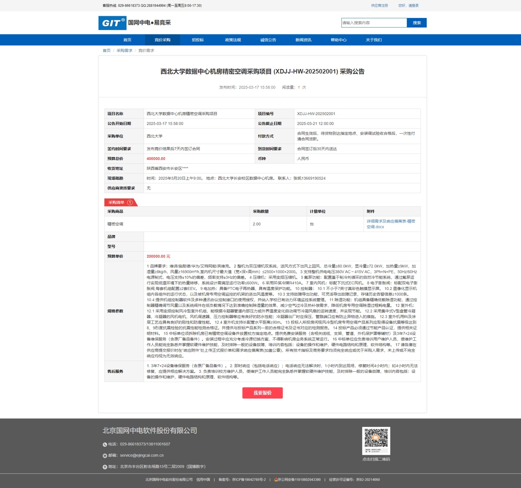 云博app官方在线入口数据中心机房精密空调采购项目 (XDJJ-HW-202502001)网上竞价采购公告 作者: 编辑:采购与招标办公室 时间:2025-03-17 原公告链接:https://www.ejingcai.com.cn/site/bidding/detail/16997
