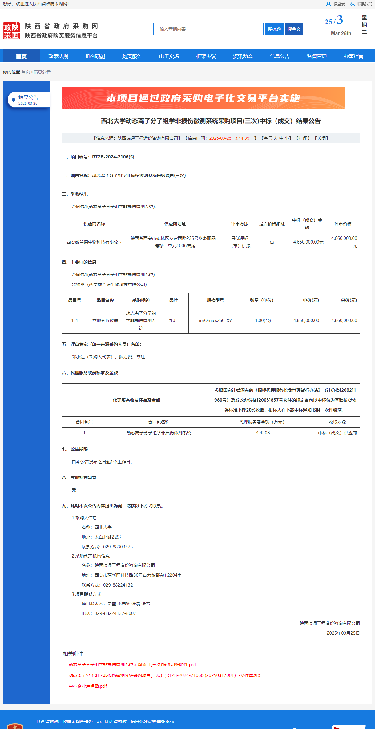 云博app官方在线入口动态离子分子组学非损伤微测系统采购项目(三次)中标(成交)结果公告 作者:采购与招标办公室 编辑: 时间:2025-03-25 原公告链接:http://www.ccgp-shaanxi.gov.cn/freecms/site/shaanxi/ggxx/info/2025/8a69c47e9566d36f0195cbcd06cf5bd8.html?noticeType=001025¬iceId=0c1c041c-093e-11f0-8063-08c0eb20c666