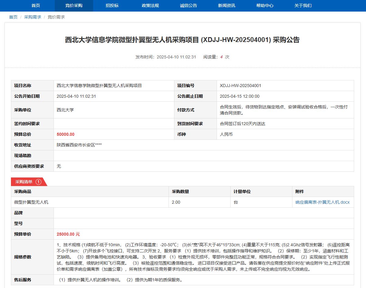 云博app官方在线入口信息学院微型扑翼型无人机采购项目(XDJJ-HW-202504001)竞价采购公告 作者:采购与招标办公室 编辑: 时间:2025-04-10 原公告链接:https://www.ejingcai.com.cn/site/bidding/detail/17536