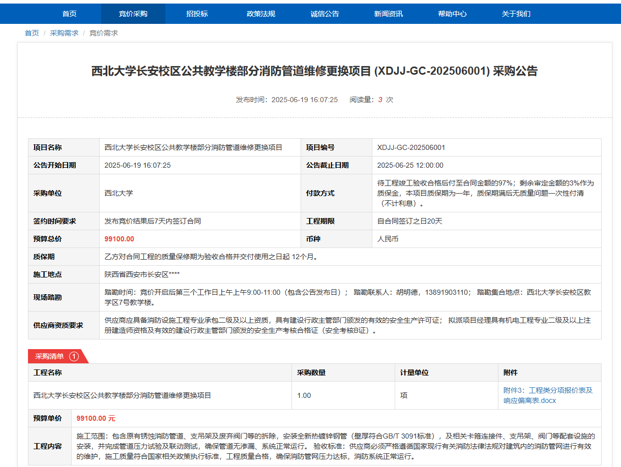 云博app官方在线入口长安校区公共教学楼部分消防管道维修更换项目(XDJJ-GC-202506001)竞价采购公告 作者:采购与招标办公室 编辑: 时间:2025-06-19 原公告链接:https://www.ejingcai.com.cn/site/bidding/detail/19038