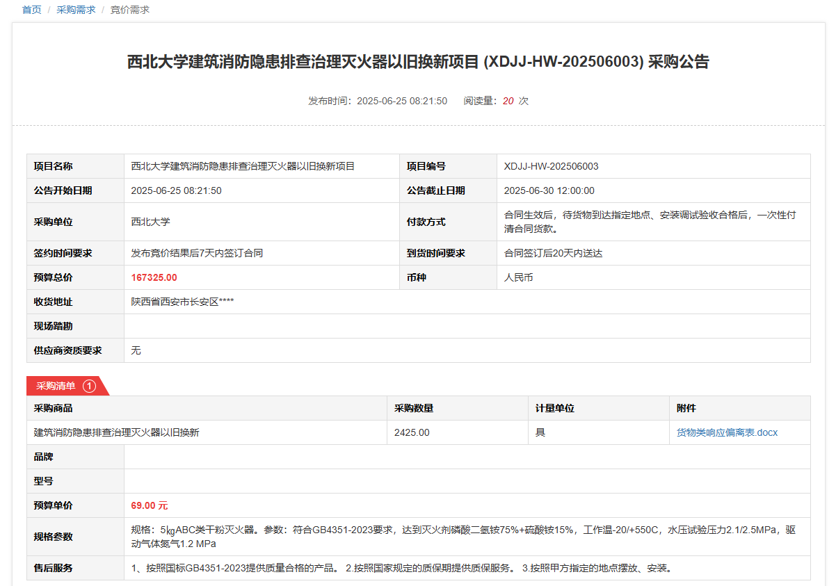 云博app官方在线入口建筑消防隐患排查治理灭火器以旧换新项目(XDJJ-HW-202506003)竞价采购公告 作者:采购与招标办公室 编辑: 时间:2025-06-25 原公告链接:https://www.ejingcai.com.cn/site/bidding/detail/19167