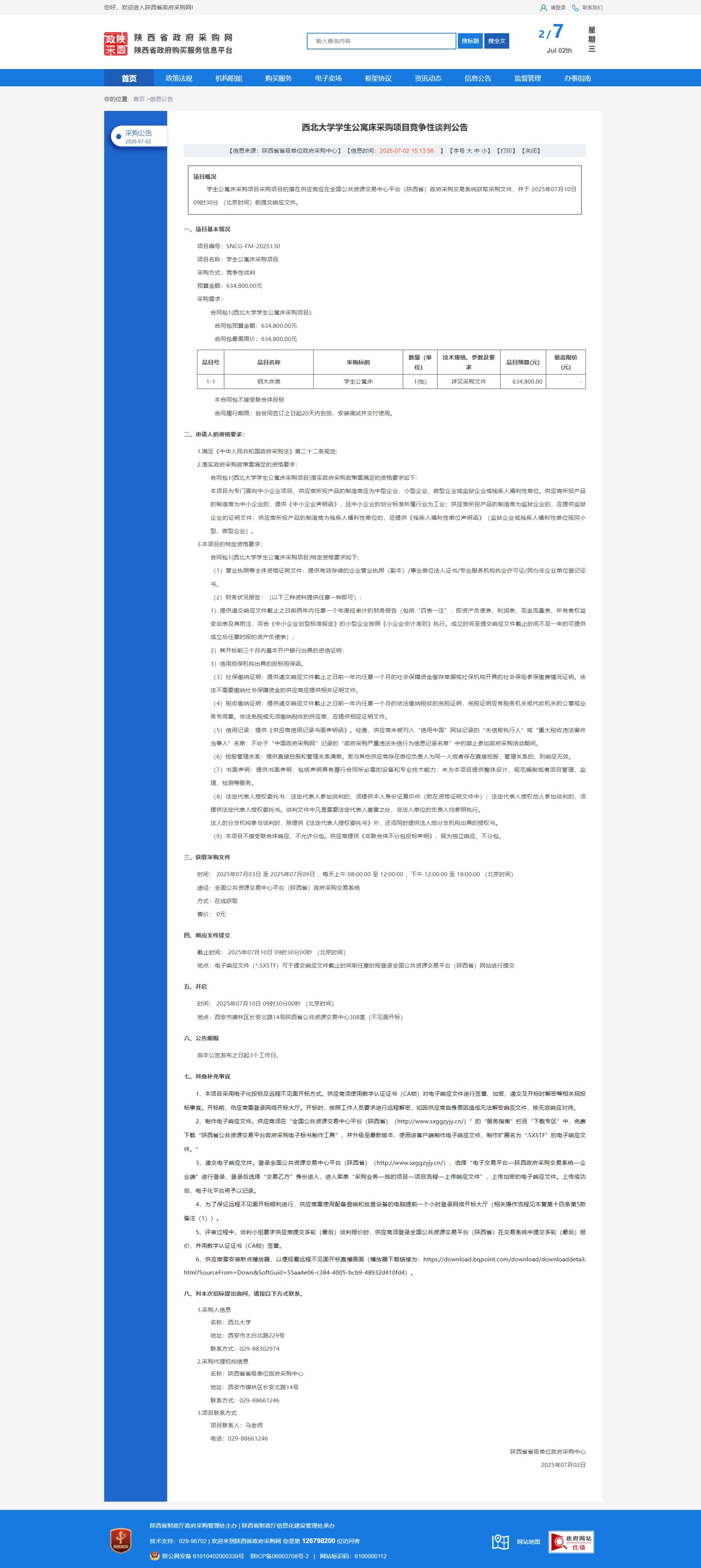 云博app官方在线入口学生公寓床采购项目竞争性谈判公告 作者: 编辑:采购与招标办公室 时间:2025-07-02 原公告链接:https://www.ccgp-shaanxi.gov.cn/freecms/site/shaanxi/ggxx/info/2025/8a69c67497a9ff030197c8e900a9510c.html?noticeType=001013¬iceId=1bd2af55-5716-11f0-8063-08c0eb20c666