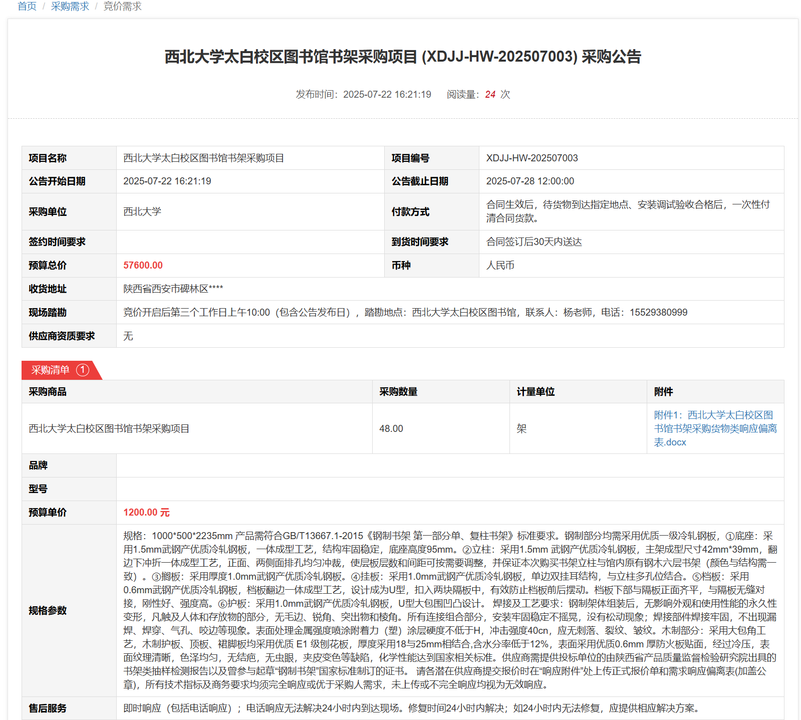 云博app官方在线入口太白校区图书馆书架采购项目(XDJJ-HW-202507003)竞价采购公告