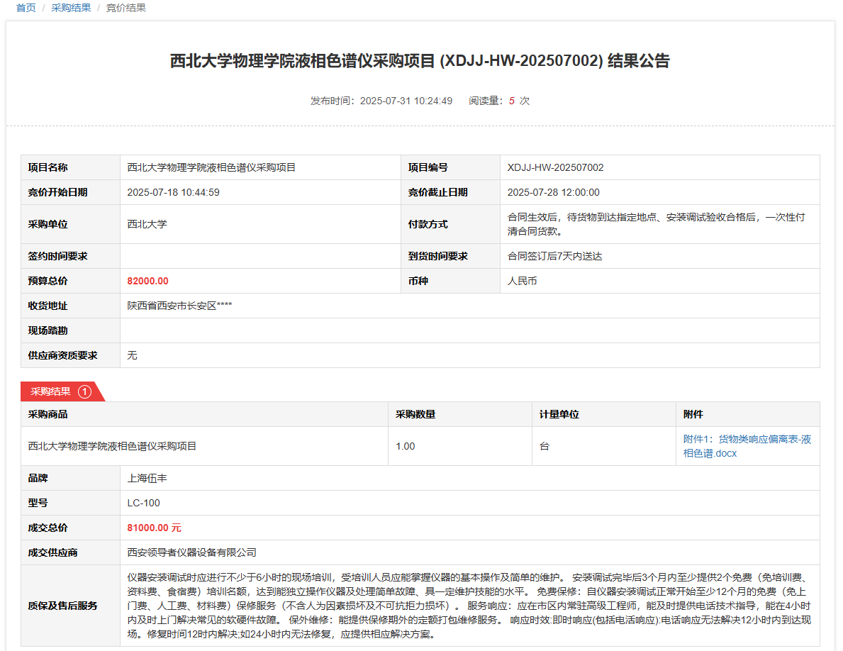 云博app官方在线入口物理学院液相色谱仪采购项目(XDJJ-HW-202507002)竞价结果公告