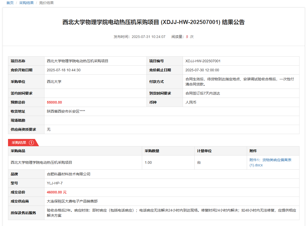 云博app官方在线入口物理学院液相色谱仪采购项目(XDJJ-HW-202507002)竞价结果公告