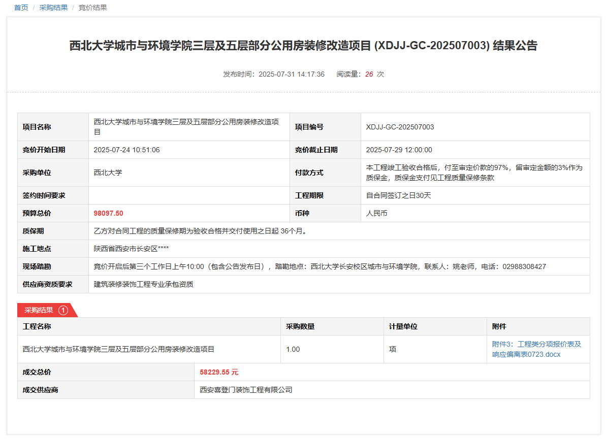 云博app官方在线入口城市与环境学院三层及五层部分公用房装修改造项目(XDJJ-GC-202507003)竞价结果公告