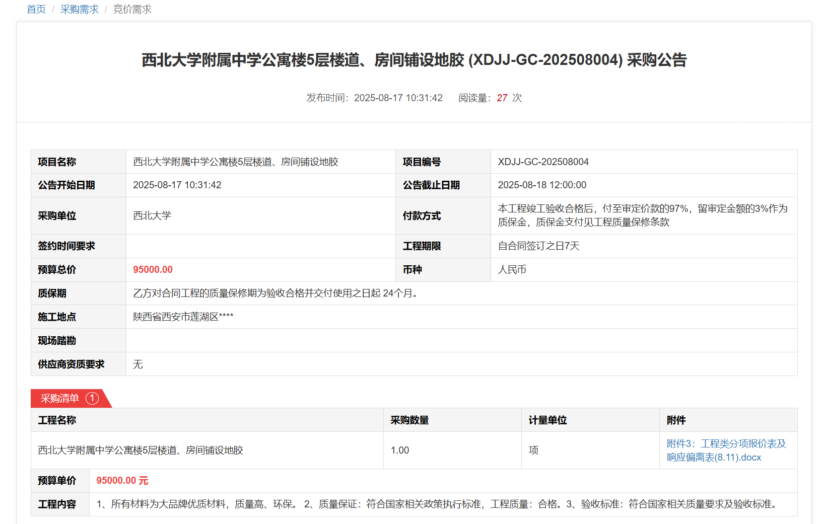 云博app官方在线入口附属中学公寓楼5层楼道、房间铺设地胶(XDJJ-GC-202508004)竞价采购公告