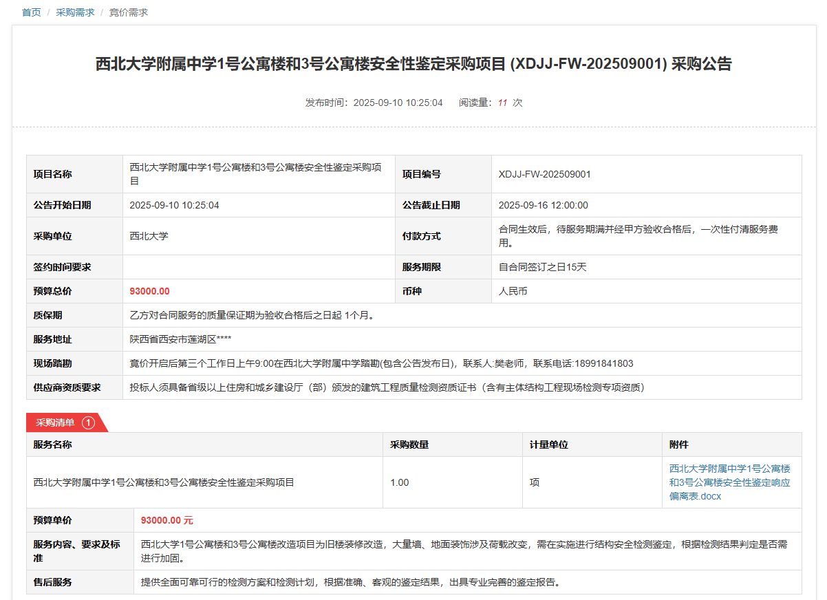 云博app官方在线入口附属中学1号公寓楼和3号公寓楼安全性鉴定采购项目(XDJJ-FW-202509001)竞价采购公告