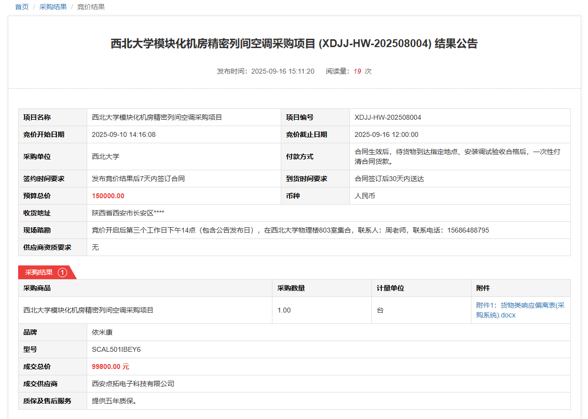 云博app官方在线入口模块化机房精密列间空调采购项目(XDJJ-HW-202508004)竞价结果公告